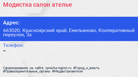 Модистка, салон-ателье по адресу 663020, Красноярский край, Емельяново, Кооперативный переулок, 3а в дальнейшем Организация, размещена в следующих категориях: