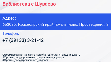 Библиотека, с. Шуваево по адресу 663035, Красноярский край, Емельяново, Просвещения, 3 в дальнейшем Организация, размещена в следующих категориях: