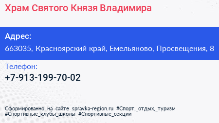 Храм Святого Князя Владимира по адресу 663035, Красноярский край, Емельяново, Просвещения, 8 в дальнейшем Организация, размещена в следующих категориях: