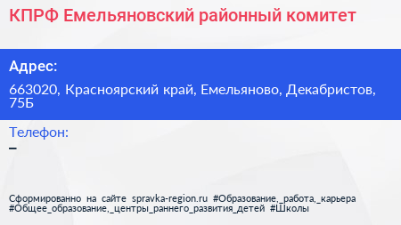 КПРФ, Емельяновский районный комитет по адресу 663020, Красноярский край, Емельяново, Декабристов, 75Б в дальнейшем Организация, размещена в следующих категориях: