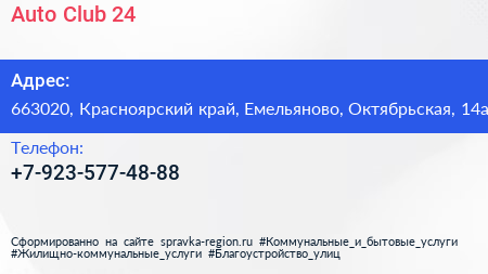Auto Club 24 по адресу 663020, Красноярский край, Емельяново, Октябрьская, 14а в дальнейшем Организация, размещена в следующих категориях: