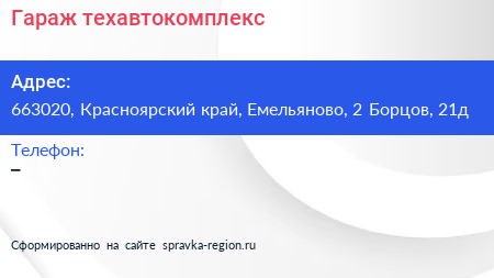 Гараж, техавтокомплекс по адресу 663020, Красноярский край, Емельяново, 2 Борцов, 21д в дальнейшем Организация, размещена в следующих категориях:
