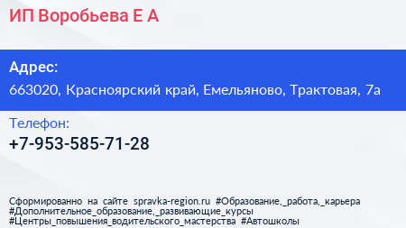 ИП Воробьева E.А. по адресу 663020, Красноярский край, Емельяново, Трактовая, 7а в дальнейшем Организация, размещена в следующих категориях: