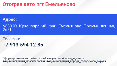 Отогрев авто, пгт Емельяново по адресу 663020, Красноярский край, Емельяново, Промышленная, 2п/1 в дальнейшем Организация, размещена в следующих категориях: