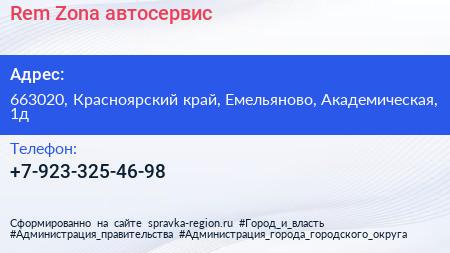 Rem-Zona, автосервис по адресу 663020, Красноярский край, Емельяново, Академическая, 1д в дальнейшем Организация, размещена в следующих категориях: