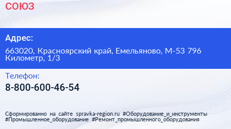 СОЮЗ по адресу 663020, Красноярский край, Емельяново, М-53 796 Километр, 1/3 в дальнейшем Организация, размещена в следующих категориях: