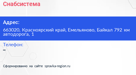 Снабсистема по адресу 663020, Красноярский край, Емельяново, Байкал 792 км автодорога, 1 в дальнейшем Организация, размещена в следующих категориях: