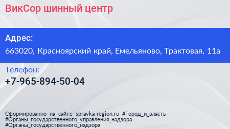 ВикСор, шинный центр по адресу 663020, Красноярский край, Емельяново, Трактовая, 11а в дальнейшем Организация, размещена в следующих категориях: