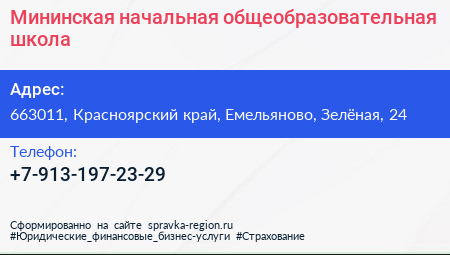 Мининская начальная общеобразовательная школа по адресу 663011, Красноярский край, Емельяново, Зелёная, 24 в дальнейшем Организация, размещена в следующих категориях: