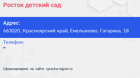 Росток, детский сад по адресу 663020, Красноярский край, Емельяново, Гагарина, 18 в дальнейшем Организация, размещена в следующих категориях: