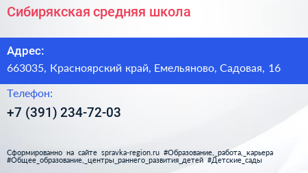 Сибирякская средняя школа по адресу 663035, Красноярский край, Емельяново, Садовая, 16 в дальнейшем Организация, размещена в следующих категориях:
