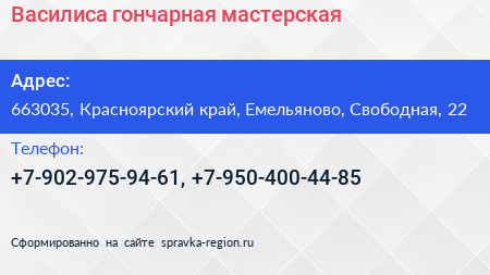 Василиса, гончарная мастерская по адресу 663035, Красноярский край, Емельяново, Свободная, 22 в дальнейшем Организация, размещена в следующих категориях: