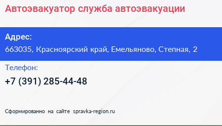 Автоэвакуатор, служба автоэвакуации по адресу 663035, Красноярский край, Емельяново, Степная, 2 в дальнейшем Организация, размещена в следующих категориях: