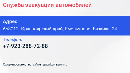 Служба эвакуации автомобилей по адресу 663012, Красноярский край, Емельяново, Базаиха, 24 в дальнейшем Организация, размещена в следующих категориях: