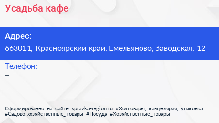 Усадьба, кафе по адресу 663011, Красноярский край, Емельяново, Заводская, 12 в дальнейшем Организация, размещена в следующих категориях: