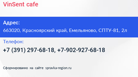 VinSent cafe по адресу 663020, Красноярский край, Емельяново, СПТУ-81, 2л в дальнейшем Организация, размещена в следующих категориях: