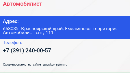 Автомобилист по адресу 663035, Красноярский край, Емельяново, территория Автомобилист снт, 111 в дальнейшем Организация, размещена в следующих категориях: