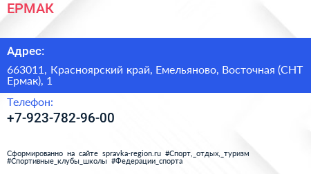 ЕРМАК по адресу 663011, Красноярский край, Емельяново, Восточная (СНТ Ермак), 1 в дальнейшем Организация, размещена в следующих категориях: