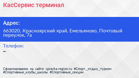 КасСервис, терминал по адресу 663020, Красноярский край, Емельяново, Почтовый переулок, 7а в дальнейшем Организация, размещена в следующих категориях: