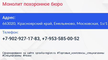 Монолит, похоронное бюро по адресу 663020, Красноярский край, Емельяново, Московская, 1з/1 в дальнейшем Организация, размещена в следующих категориях: