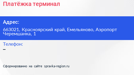 Платёжка, терминал по адресу 663021, Красноярский край, Емельяново, Аэропорт Черемшанка, 1 в дальнейшем Организация, размещена в следующих категориях: