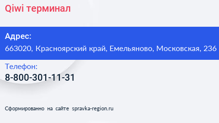Qiwi, терминал по адресу 663020, Красноярский край, Емельяново, Московская, 236 в дальнейшем Организация, размещена в следующих категориях: