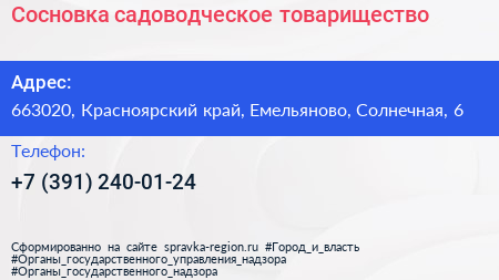 Сосновка, садоводческое товарищество по адресу 663020, Красноярский край, Емельяново, Солнечная, 6 в дальнейшем Организация, размещена в следующих категориях: