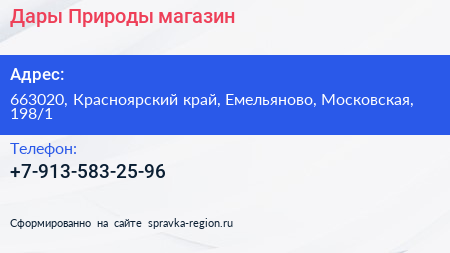 Дары Природы, магазин по адресу 663020, Красноярский край, Емельяново, Московская, 198/1 в дальнейшем Организация, размещена в следующих категориях: