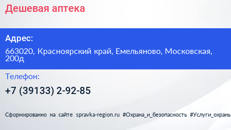 Дешевая аптека по адресу 663020, Красноярский край, Емельяново, Московская, 200д в дальнейшем Организация, размещена в следующих категориях: