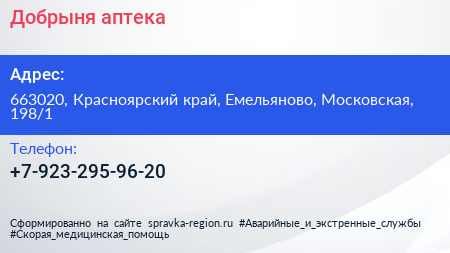 Добрыня, аптека по адресу 663020, Красноярский край, Емельяново, Московская, 198/1 в дальнейшем Организация, размещена в следующих категориях: