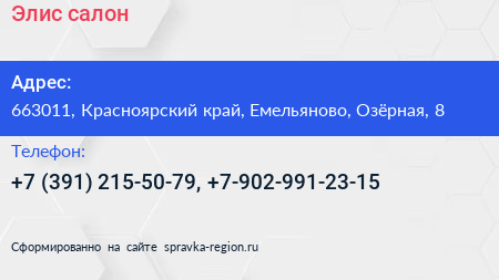 Элис, салон по адресу 663011, Красноярский край, Емельяново, Озёрная, 8 в дальнейшем Организация, размещена в следующих категориях: