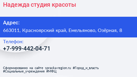Надежда, студия красоты по адресу 663011, Красноярский край, Емельяново, Озёрная, 8 в дальнейшем Организация, размещена в следующих категориях: