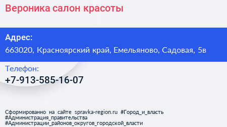 Вероника, салон красоты по адресу 663020, Красноярский край, Емельяново, Садовая, 5в в дальнейшем Организация, размещена в следующих категориях: