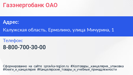 Газэнергобанк, ОАО по адресу Калужская область, Ермолино, улица Мичурина, 1 в дальнейшем Организация, размещена в следующих категориях:
