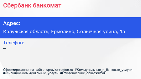 Сбербанк, банкомат по адресу Калужская область, Ермолино, Солнечная улица, 1а в дальнейшем Организация, размещена в следующих категориях: