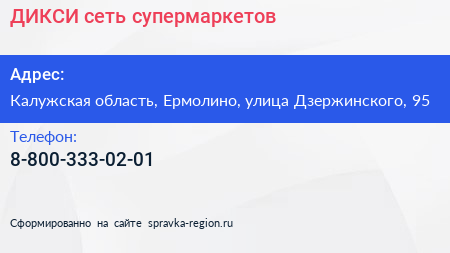 ДИКСИ, сеть супермаркетов по адресу Калужская область, Ермолино, улица Дзержинского, 95 в дальнейшем Организация, размещена в следующих категориях: