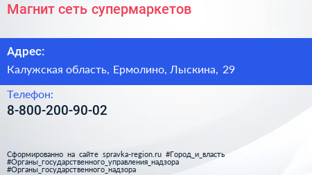 Магнит, сеть супермаркетов по адресу Калужская область, Ермолино, Лыскина, 29 в дальнейшем Организация, размещена в следующих категориях:
