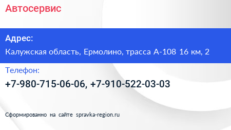 Автосервис по адресу Калужская область, Ермолино, трасса А-108 16 км, 2 в дальнейшем Организация, размещена в следующих категориях: