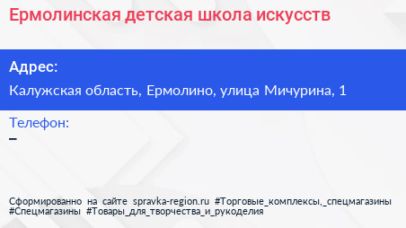 Ермолинская детская школа искусств по адресу Калужская область, Ермолино, улица Мичурина, 1 в дальнейшем Организация, размещена в следующих категориях: