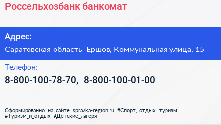 Россельхозбанк, банкомат по адресу Саратовская область, Ершов, Коммунальная улица, 15 в дальнейшем Организация, размещена в следующих категориях: