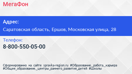 МегаФон по адресу Саратовская область, Ершов, Московская улица, 28 в дальнейшем Организация, размещена в следующих категориях: