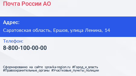 Почта России, АО по адресу Саратовская область, Ершов, улица Ленина, 14 в дальнейшем Организация, размещена в следующих категориях: