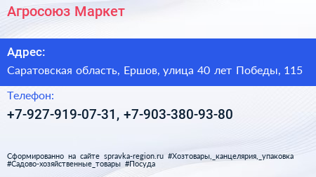 Агросоюз-Маркет по адресу Саратовская область, Ершов, улица 40 лет Победы, 115 в дальнейшем Организация, размещена в следующих категориях: