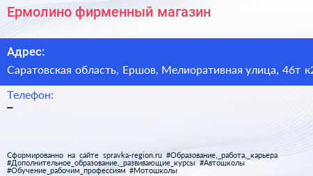 Ермолино, фирменный магазин по адресу Саратовская область, Ершов, Мелиоративная улица, 46т к2 в дальнейшем Организация, размещена в следующих категориях: