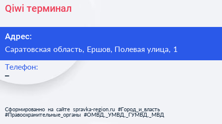 Qiwi, терминал по адресу Саратовская область, Ершов, Полевая улица, 1 в дальнейшем Организация, размещена в следующих категориях: