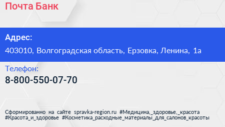Почта Банк по адресу 403010, Волгоградская область, Ерзовка, Ленина, 1а в дальнейшем Организация, размещена в следующих категориях: