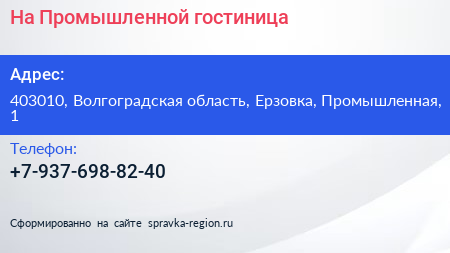 На Промышленной, гостиница по адресу 403010, Волгоградская область, Ерзовка, Промышленная, 1 в дальнейшем Организация, размещена в следующих категориях: