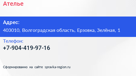 Ателье по адресу 403010, Волгоградская область, Ерзовка, Зелёная, 1 в дальнейшем Организация, размещена в следующих категориях: