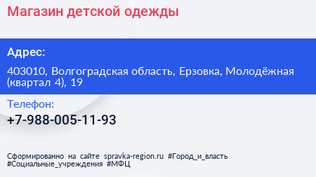 Магазин детской одежды по адресу 403010, Волгоградская область, Ерзовка, Молодёжная (квартал 4), 19 в дальнейшем Организация, размещена в следующих категориях: