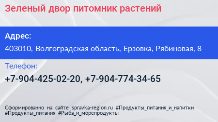Зеленый двор, питомник растений по адресу 403010, Волгоградская область, Ерзовка, Рябиновая, 8 в дальнейшем Организация, размещена в следующих категориях: